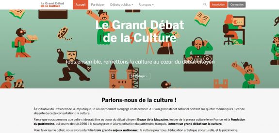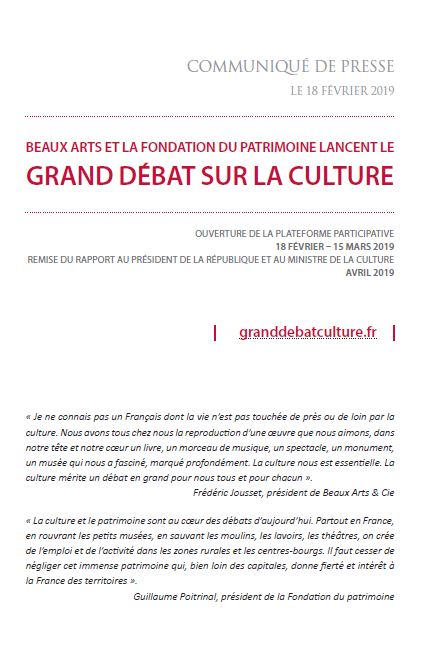 Du 18 février au 15 mars 2019, Beaux Arts Magazine et la Fondation du patrimoine lancent un Grand Débat sur la Culture. L’initiative vise à remettre la culture, grande absente des quatre thématiques du Grand Débat national lancé à l’initiative du Président de la République par le Gouvernement en décembre 2018, au cœur du débat citoyen.