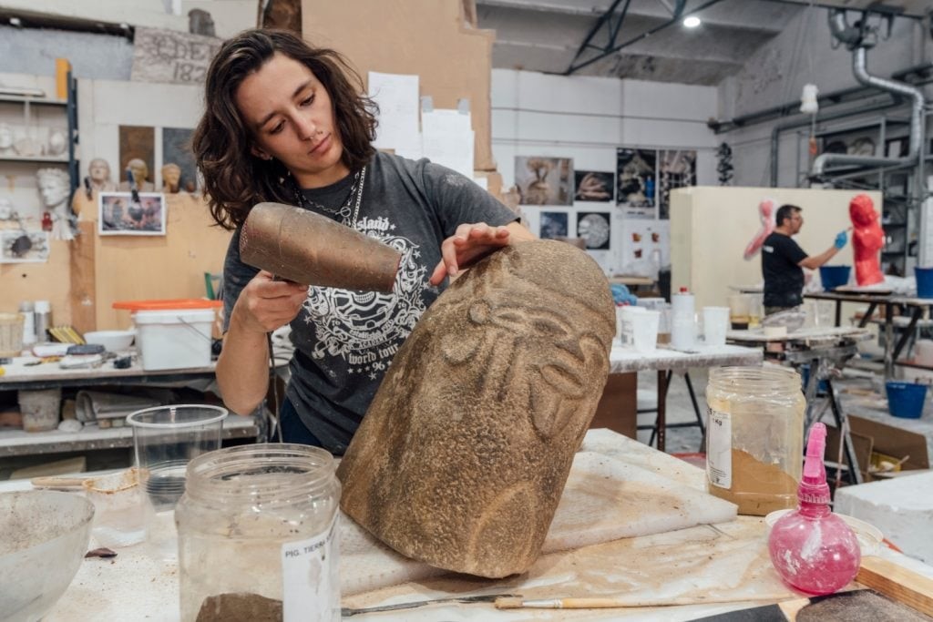 Fabrication du fac-similé du monolithe de Bakor offert au Chrysler Museum. Photo : © Oak Taylor-Smith pour la Fondation Factum.