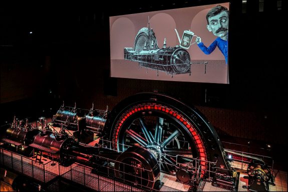 Les visiteurs peuvent désormais accéder directement à la grande salle du musée et découvrir trois films d’animation de 4 minutes, projetés directement au-dessus du groupe électrogène. Replaçant la machine dans l’histoire de la ville et dans le contexte de la belle époque, ces films décalés sont de plus synchronisés avec des jeux de lumière qui la mettent en valeur.