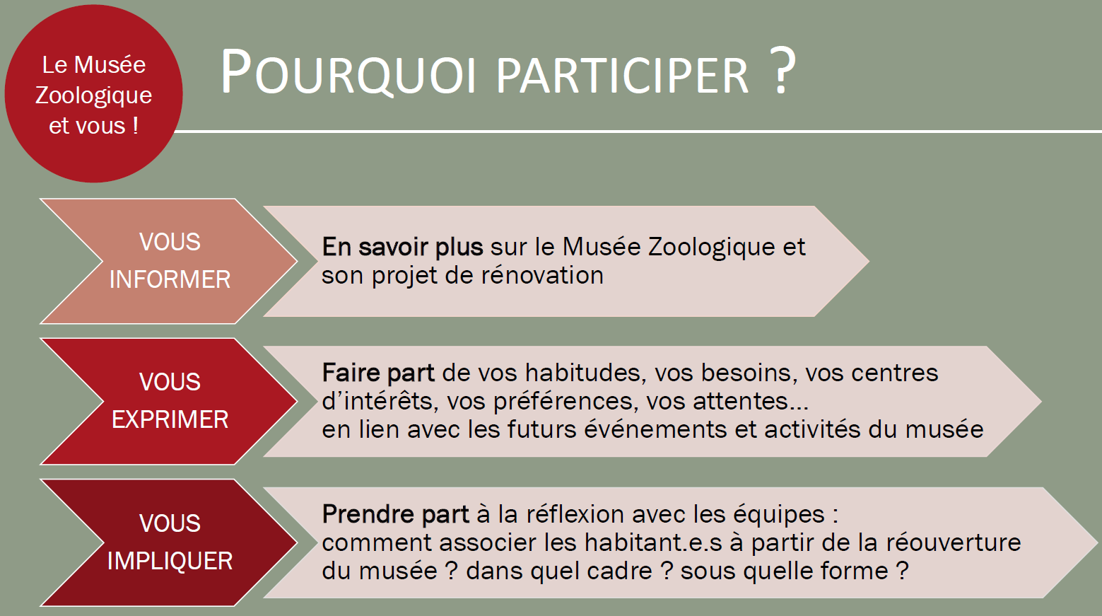 Dans ce cadre, les équipes des Musées de la Ville et du Jardin des sciences ont souhaité associer les habitant à la future programmation du Musée Zoologique, à travers une démarche participative.