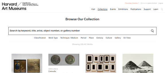 Les musées d’Harvard diffusent leurs collections depuis environ 15 ans sur leur propre site internet, y compris des images haute résolution et des informations détaillées sur les objets. En complément, la participation à  la plate-forme de Google « permet l’interconnexion avec les collections d’autres institutions, permettant un meilleur accès et une plus grande découverte à  l’échelle mondiale ».