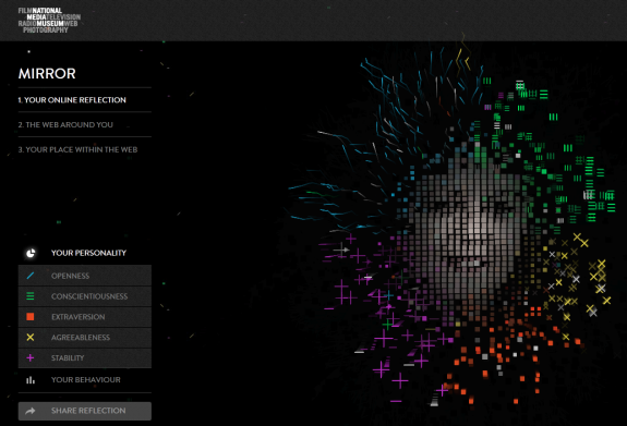 L’automne dernier, le National Media Museum au Royaume-Uni a lancé un reflet en ligne interactif ou « miroir » permettant aux utilisateurs de se voir virtuellement, c’est €‘à  €‘dire de se voir en tant que personnes au sein de leur existence numérique.