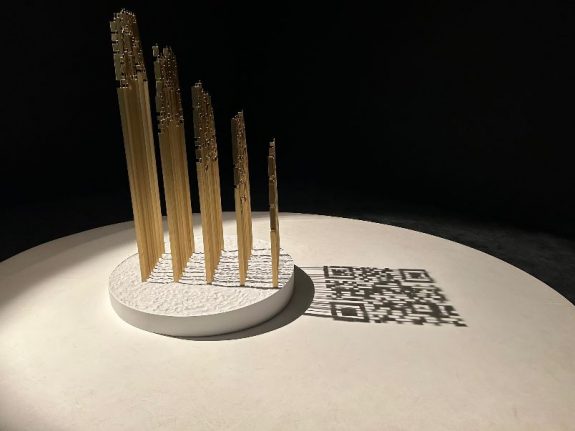 La seconde œuvre de cette exposition Σ Lumina est une installation qui suscite la participation active du public. Dans une pièce fermée au fond de la Nef, une lumière en rotation sur un rythme analogue à celui du soleil traverse une statue métallique, dont l’ombre dessine au sol un QR code. Une fois scanné, celui-ci renvoie vers une œuvre numérique que le visiteur est amené à co-créer par son souffle dans le téléphone. Au terme du processus, cette création interactive est inscrite pour toujours sur la blockchain.