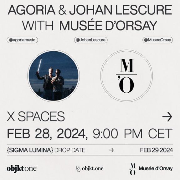 Désireux d’explorer les nouveaux territoires du Web3, le musée d’Orsay, Agoria et Johan Lescure ont ouvert le jeudi 29 février 2024 une vente aux enchères de 7 œuvres uniques sur la plateforme Objkt One.