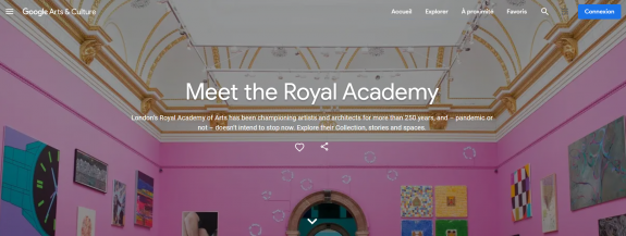 « Nous ne pouvons pas encore ouvrir nos portes – mais aujourd’hui, nous vous invitons à l’intérieur ! » Depuis le 17 juin 2020, les amateurs d’art peuvent explorer sur Google Arts & Culture la collection, les trésors et les salles de la Royal Academy of Arts de Londres, alors même que le lieu est fermé à cause du coronavirus. Grace aux visites street-view, aux zooms gigapixels sur les œuvres et aux contenus vidéos, le public du monde entier peut ainsi découvrir chez lui 250 ans d’histoires et d’expositions estivales, la querelle entre Constable et Turner et les mystères de la Cène de Da Vinci.