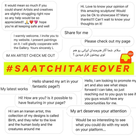 Le 23 mars 2020, la Saatchi Gallery a lancé son initiative de médias sociaux, #SaatchiTakeover, visant à  engager son public avec l’art et la créativité du monde entier. Initialement prévue pour célébrer son 35ème anniversaire, cette campagne prend une nouvelle dimension avec la crise sanitaire globale.