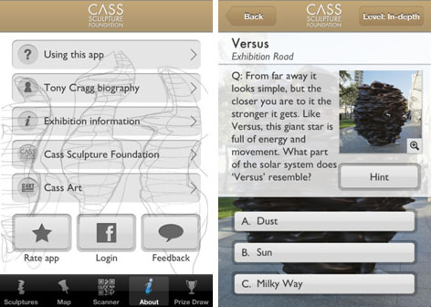 Mark Cass, le Président de la Fondation Cass Sculpture souligne « notre nouvelle application permet aux visiteurs de découvrir Tony Cragg en interagissant et apprenant de chacune des 11 œuvres installées autour des musées culturels et éducatifs dans le coeur de Londres. Nous sommes excités que chacun puisse partager son expérience avec des amis et la famille via les médias sociaux. »